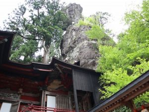 本社(の屋根の部分)「お姿岩」と呼ばれる岩山に組み込まれるような構造で、岩の中の洞窟にご神体が祭られているそうです。