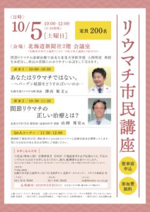 2019/10/5 10:00〜 リウマチ市民講座を開催いたします。事前申し込みが必要です。申し込み方法は上記の画像に記載してありますので、画像をクリックして下さい。