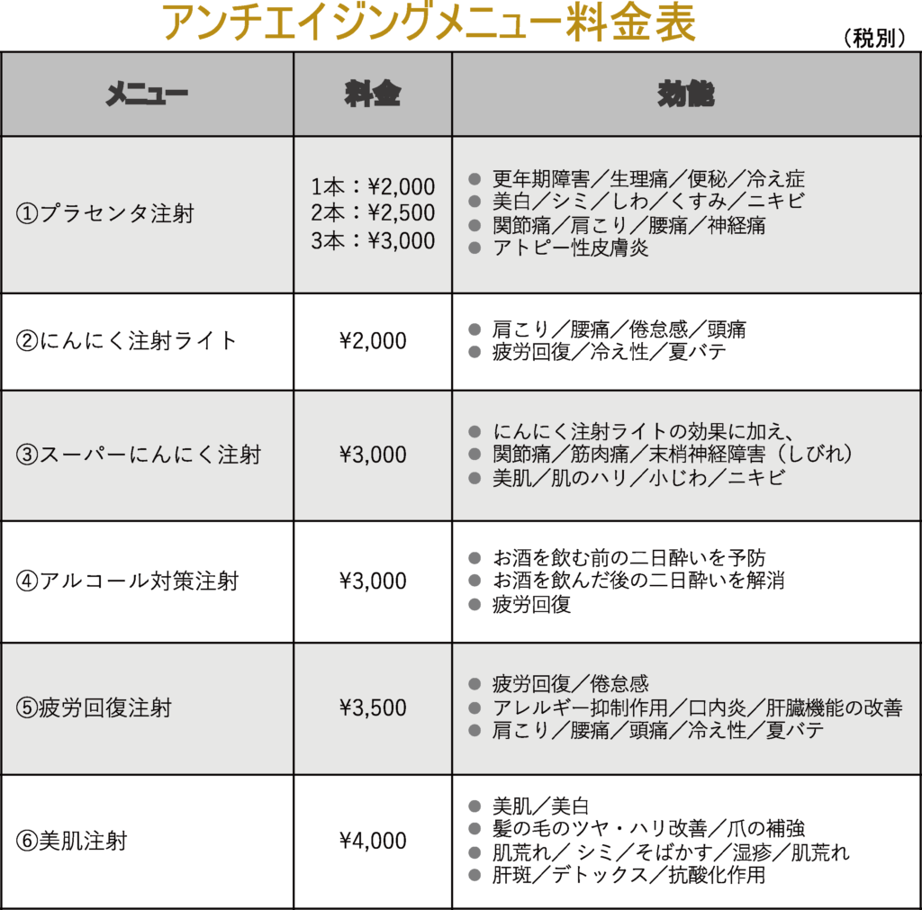 プラセンタ注射、にんにく注射、アルコール対策注射、疲労回復注射、美肌注射などがあります。