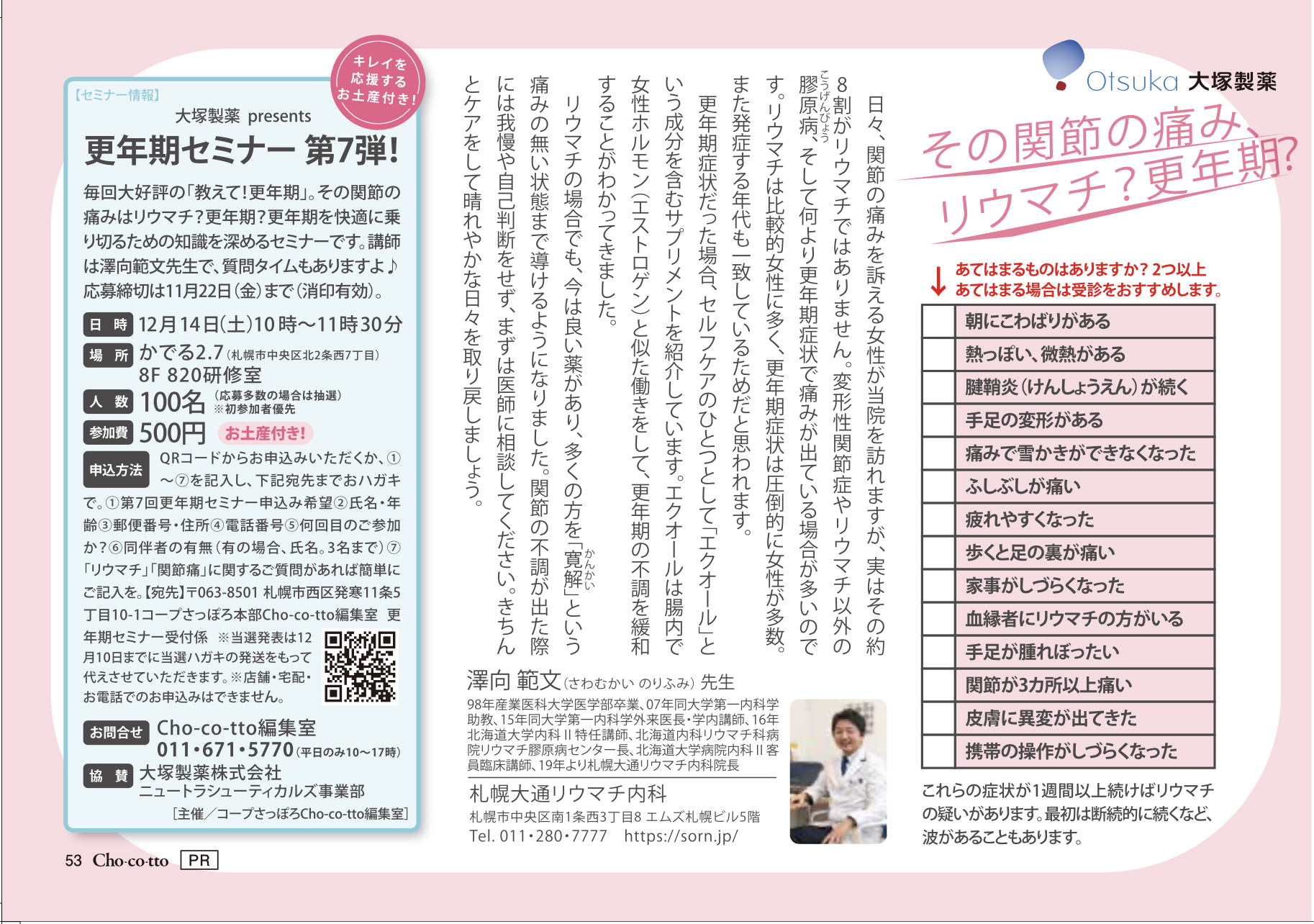 Cho-co-tto 11月号掲載 (↑クリック) その関節痛はリウマチ?更年期? 2019年12月14日に更年期セミナー第7弾で、院長が講演します。 申込方法は上記記事に記載されてます。締め切りは11/22ですのでお早めに!